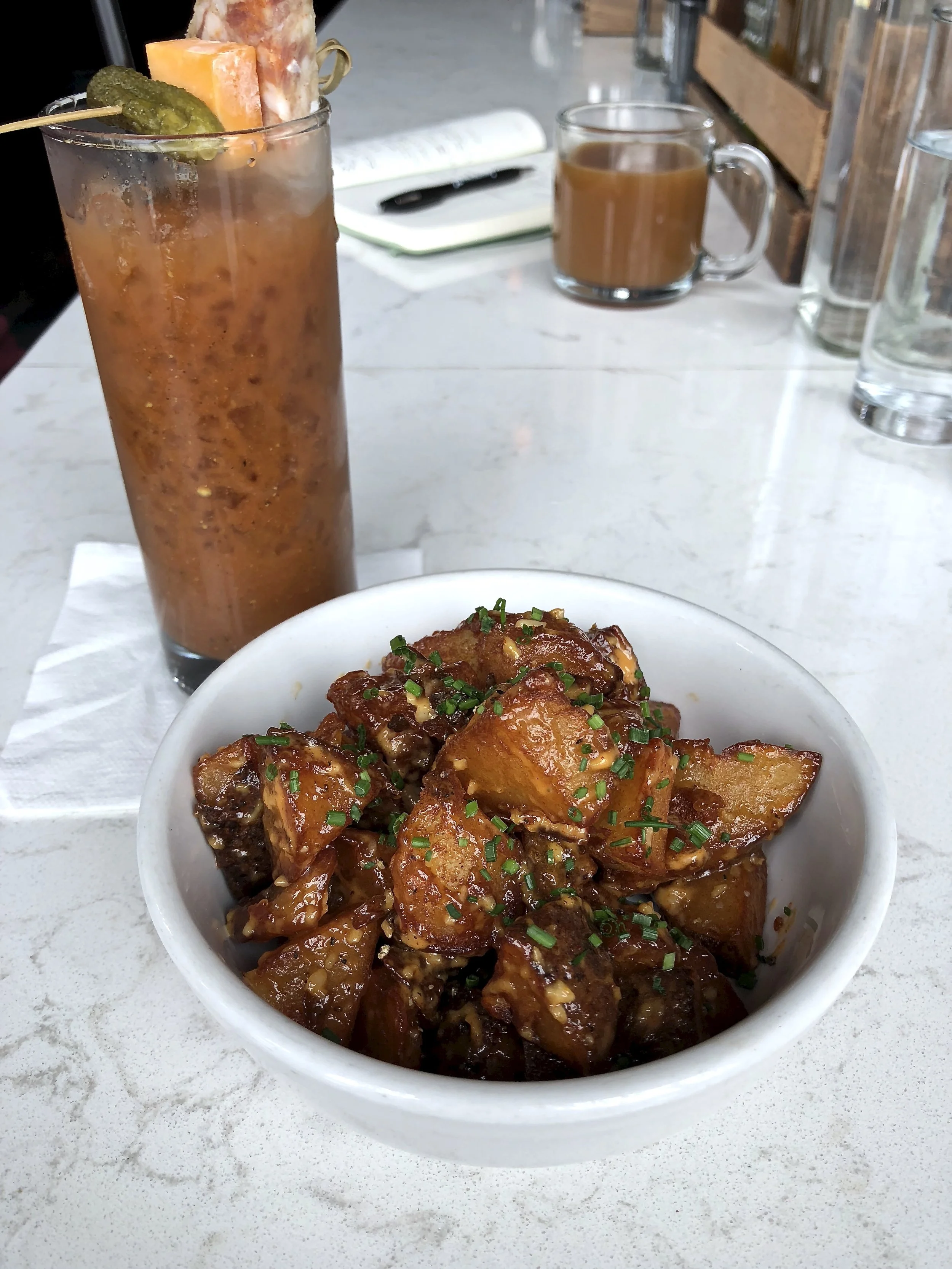 On the food side, I have to give a shout out to the chef for the ingenious idea to add Bloody Mary home fries to the menu and you bet I gave them a try. These crispy potato cubes arrive in a bowl tossed in a Bloody Mary aioli with minced garlic and green onions on top. Interestingly enough, the recipe used in the aioli is a completely different recipe than the one used in beverage form. I guess the kitchen wanted its own glory! The aroma of garlic and spice is a pungent kick in the nose reminding me of eating a delicious hot wing. Definitely a solid pairing to kick start day drinking!